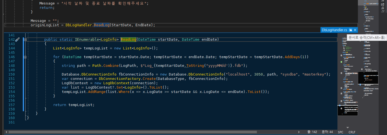 스크롤 막대 모드를 사용하면 전체 코드를 한눈에 볼수가 있다. 중단 점을 찍거나 책갈피 찍혀 있는 부분,