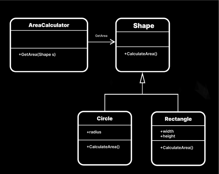 수정된 AreaCalculator Class는 이제 추상 Shape Class에서 정의한 추상 메서드를 호출하는 방식으로 처리할 수 있게 되었습니다. 이제부터는 새로운 도형 Class를 정의해도 AreaCalculator Class의 소스 코드를 변경하지 않고 GetArea를 통해 CalculateArea 기능 로직을 수행할 수 있게 되었습니다.